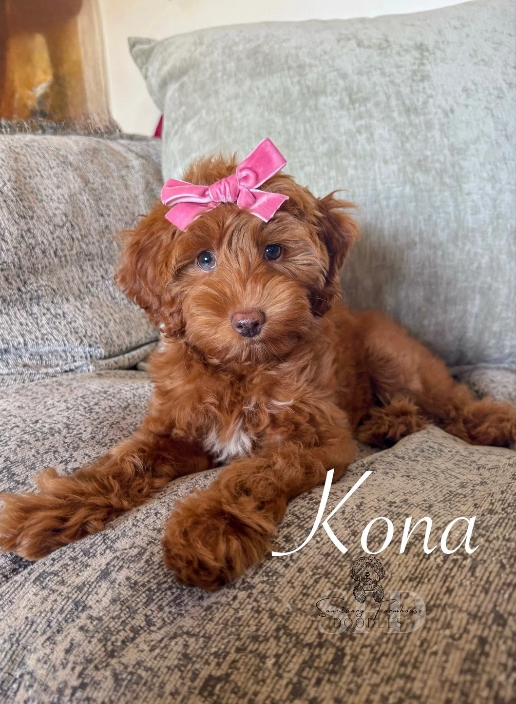 Isla is one of the most affectionate dogs we have ever owned. She loves her people big, she also does very well with other dogs. She is beyond intelligent and an incredible mother to her puppies. She is a red sable mini golden mountain doodle with wavy hair and brown eyes. She weighs 20 lbs.