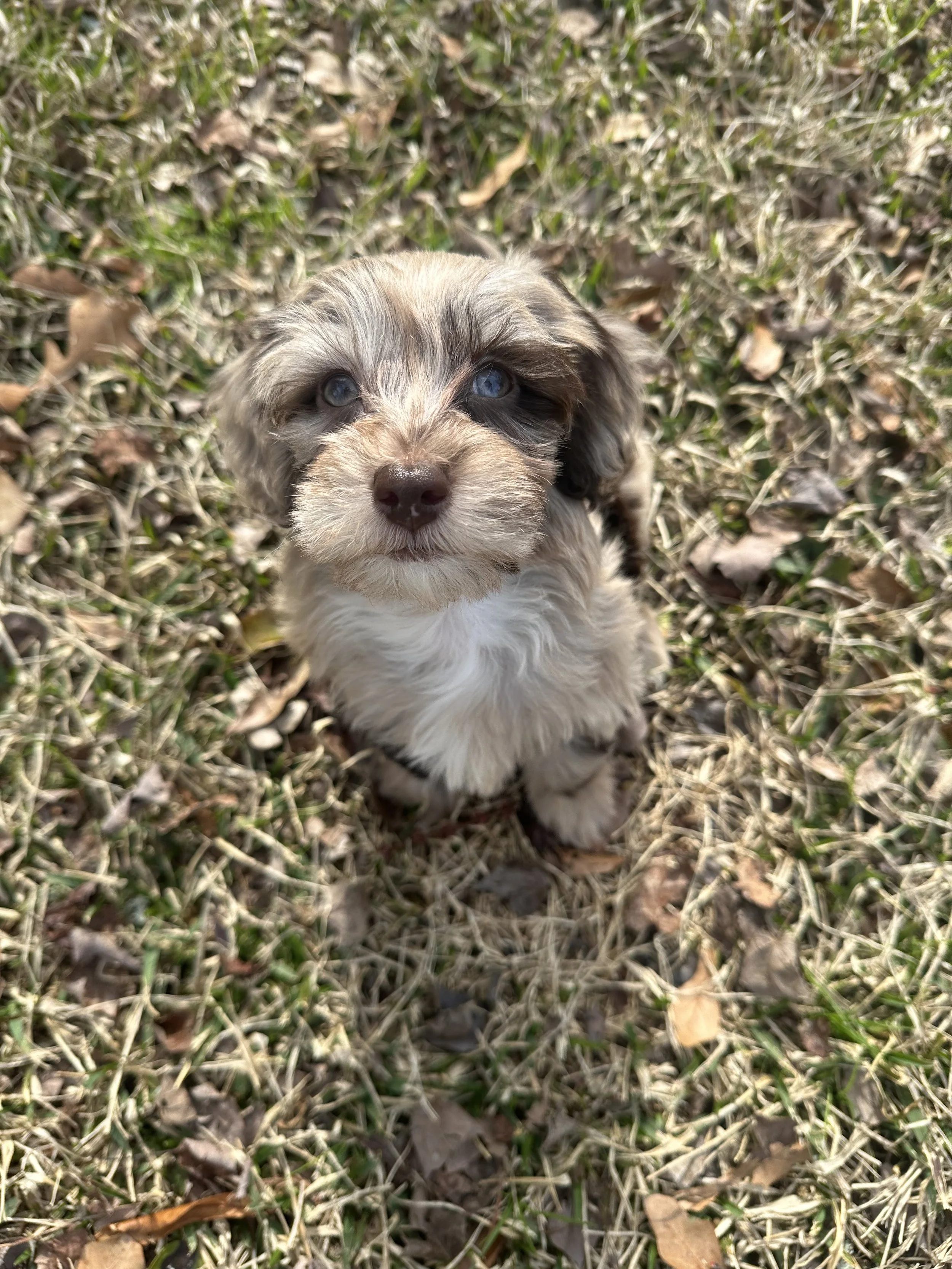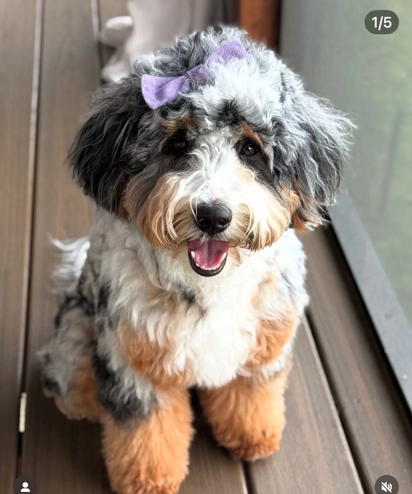 Loving, playful, so smart! Our Elsie is very calm and loves to trick train! She is a phantom tri blue merle but her spotting is black making her colors very vibrant. She is a mini golden mountain doodle and her expected weight is 25 lbs.