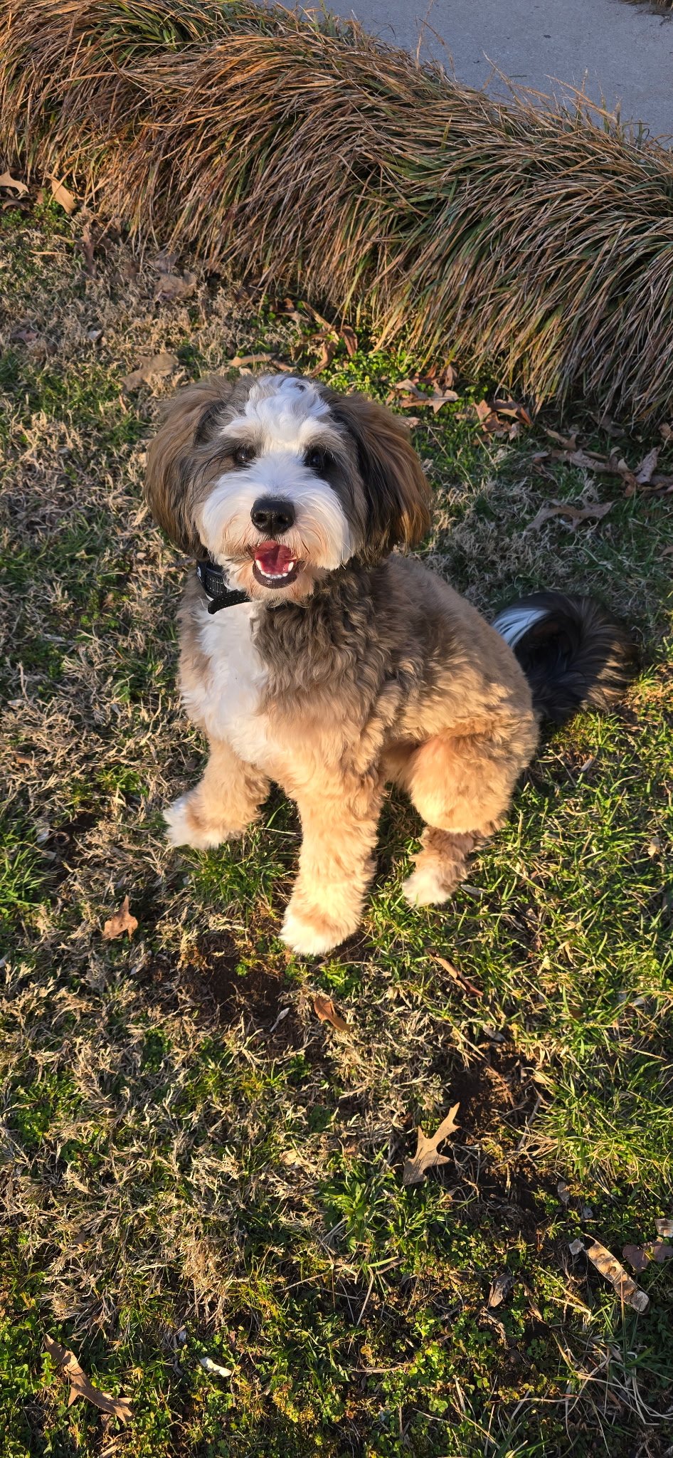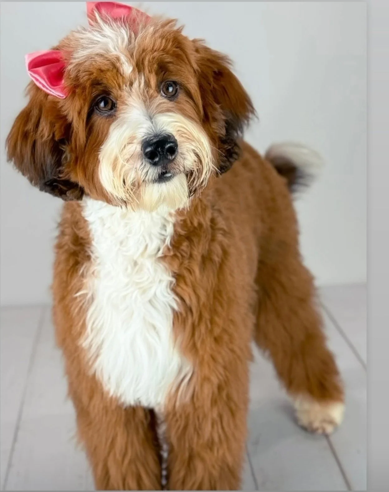 Clara is so sweet and an old soul at heart. She is a chocolate and white tuxedo mini bernedoodle and weighs 20 lbs. She's smart, lives to please and very obedient!