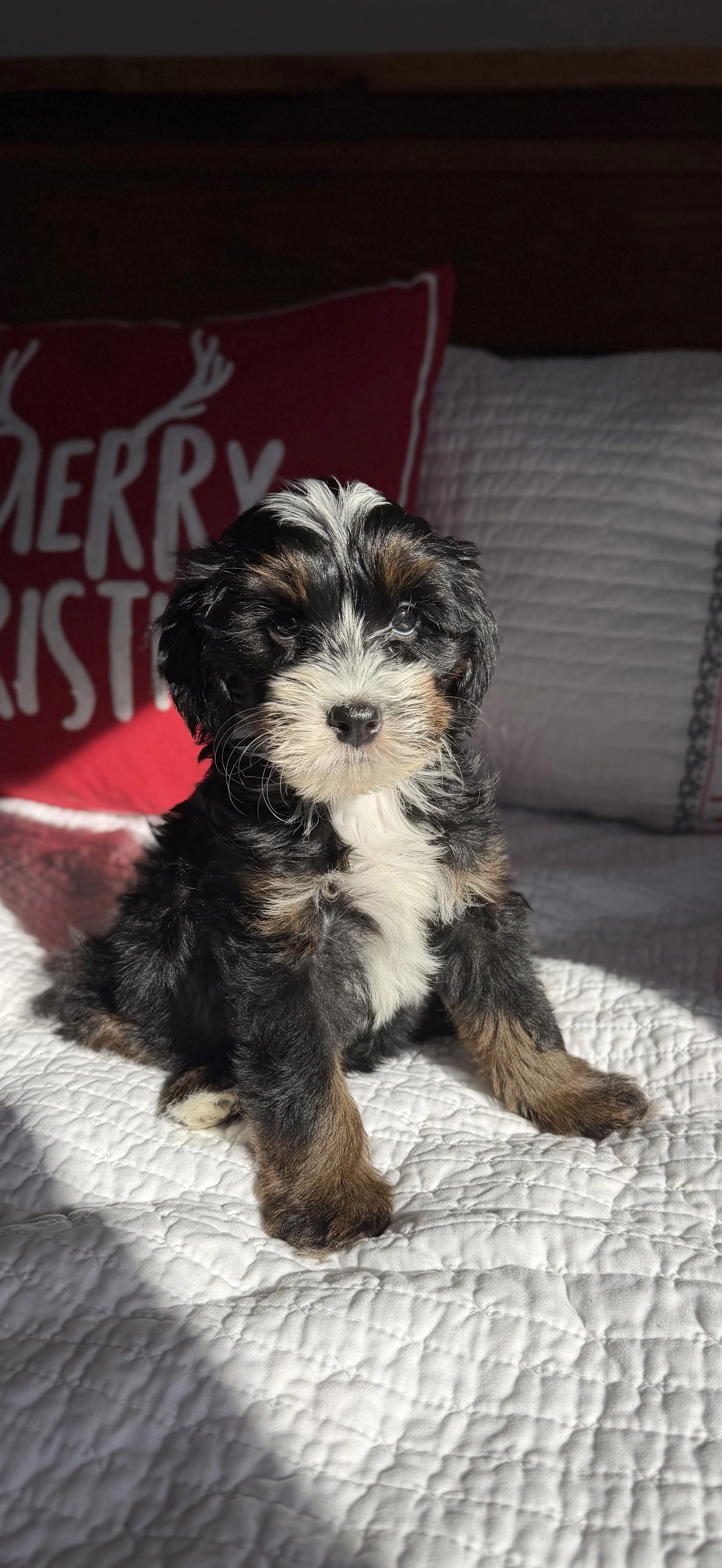 Sunny is absolutely radiant! She's just a sweetheart with a stunning Bernese body. Sunny is another one of Isla's most precious babies. She's a lovely sable mini golden mountain doodle, and we expect her to weigh around 35 pounds.
